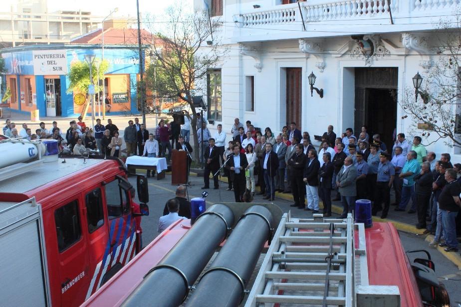El gobernador de la Provincia, Alberto Weretilneck, encabezó esta tarde el acto de entrega de vehículos especiales para los Cuarteles de Bomberos rionegrinos, y firmó además, una serie de contratos de obras y entregó aportes a instituciones.